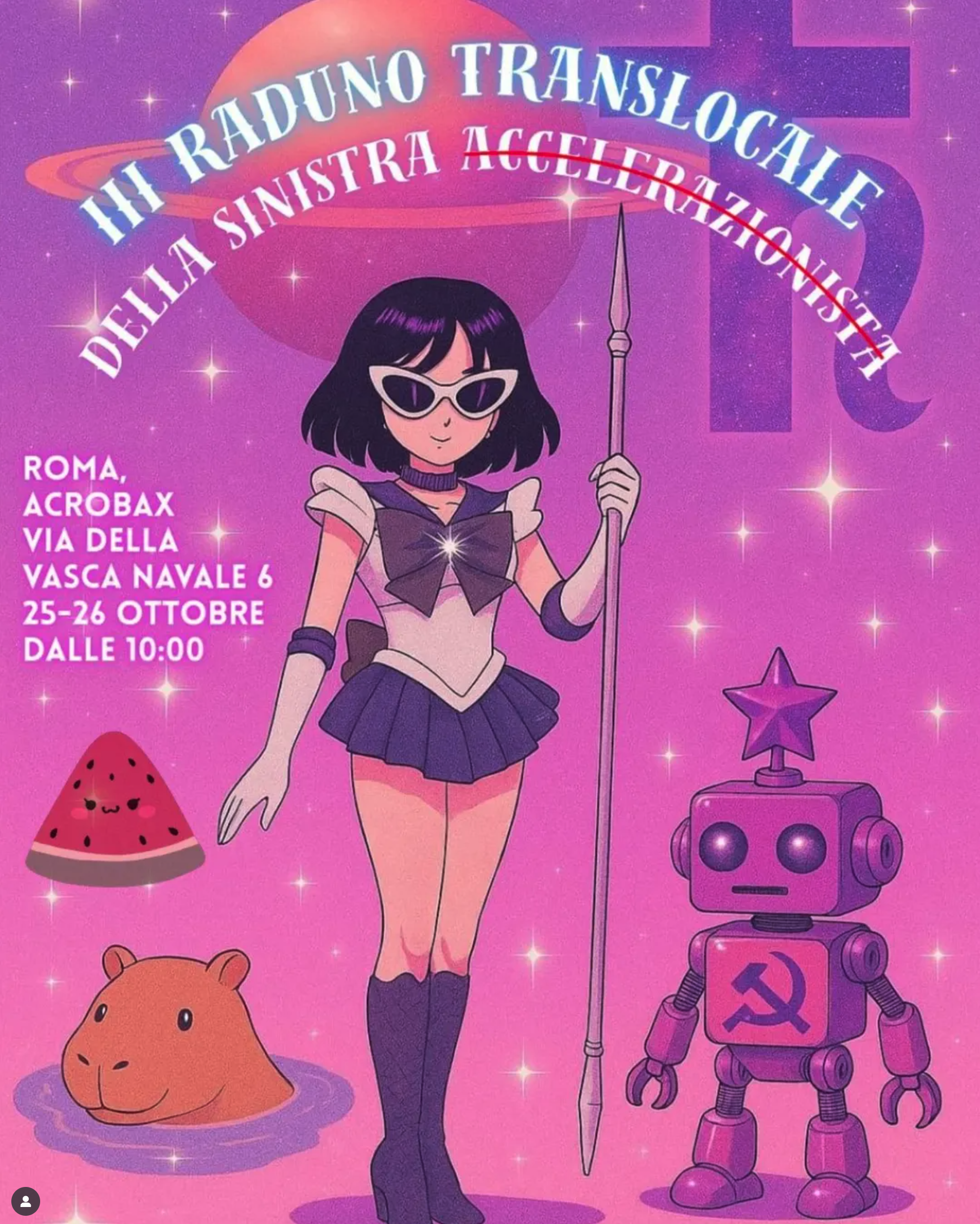 Per questo il 25 e 26 ottobre ci raduniamo a Roma, allo spazio Acrobax: sarà il Terzo Raduno Translocale della Sinistra Accelerazionista. Per connettere il nostro sentire utopico che ci pulsa nel petto. Per dare un nome forte al nostro desiderio, partendo dal sentimento della nostra epoca che Mark Fisher ha saputo evocare. Per sentirci comunità insieme.